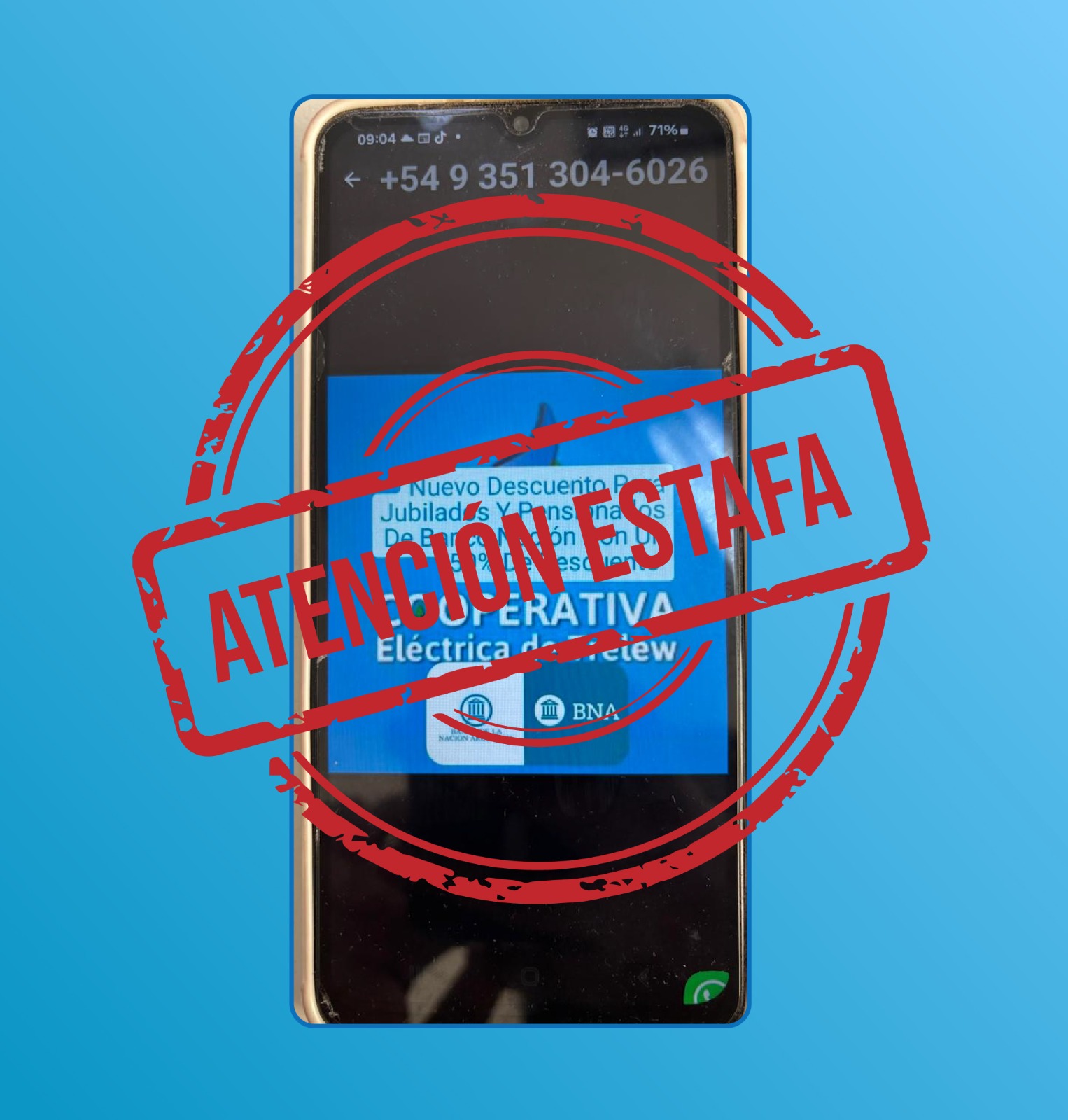 La Cooperativa Eléctrica de Trelew advierte a sus asociados sobre la existencia de nuevas modalidades de estafa, que apuntan a los jubilados y pensionados que perciben sus haberes a través del Banco Nación, y que se perpetran mediante la utilización de su nombre y la promesa de importantes descuentos en el pago de las facturas de servicios.